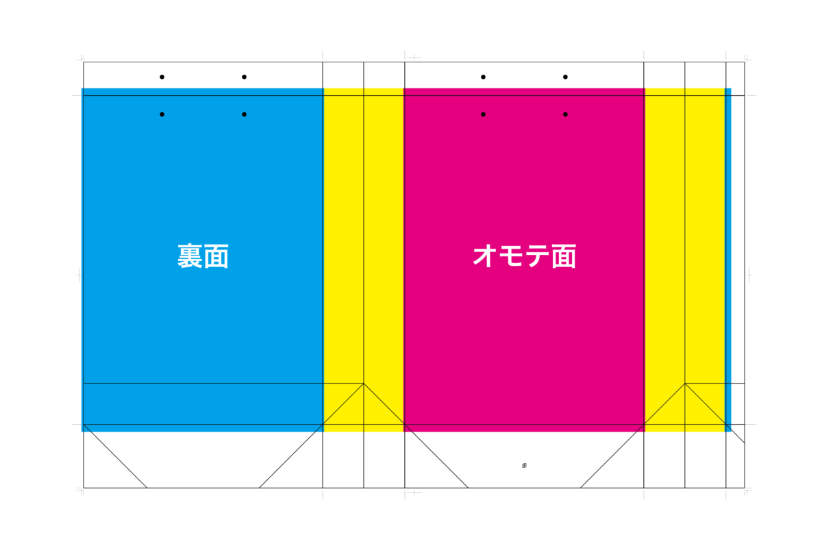 展開図(テンプレート)をイメージしてみてください。 1枚の紙の上に「正面・裏面・マチ・口折・底フラップ」がすべて並んでいます。