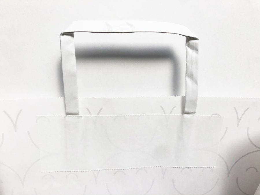 口折がない輪転式で口部分の中面に台紙についたひもを貼り付ける方法。口部分の折り返しがなく手などを切らないよう口の部分がギザギザになってます。使用できるひもには、紙単紙、紙平ひも、PPひも、アクリルスピンドル芯入などがあります。紙袋の中では最も安価に作成する方法です。弊社では海外での輪転式紙袋も承っております。